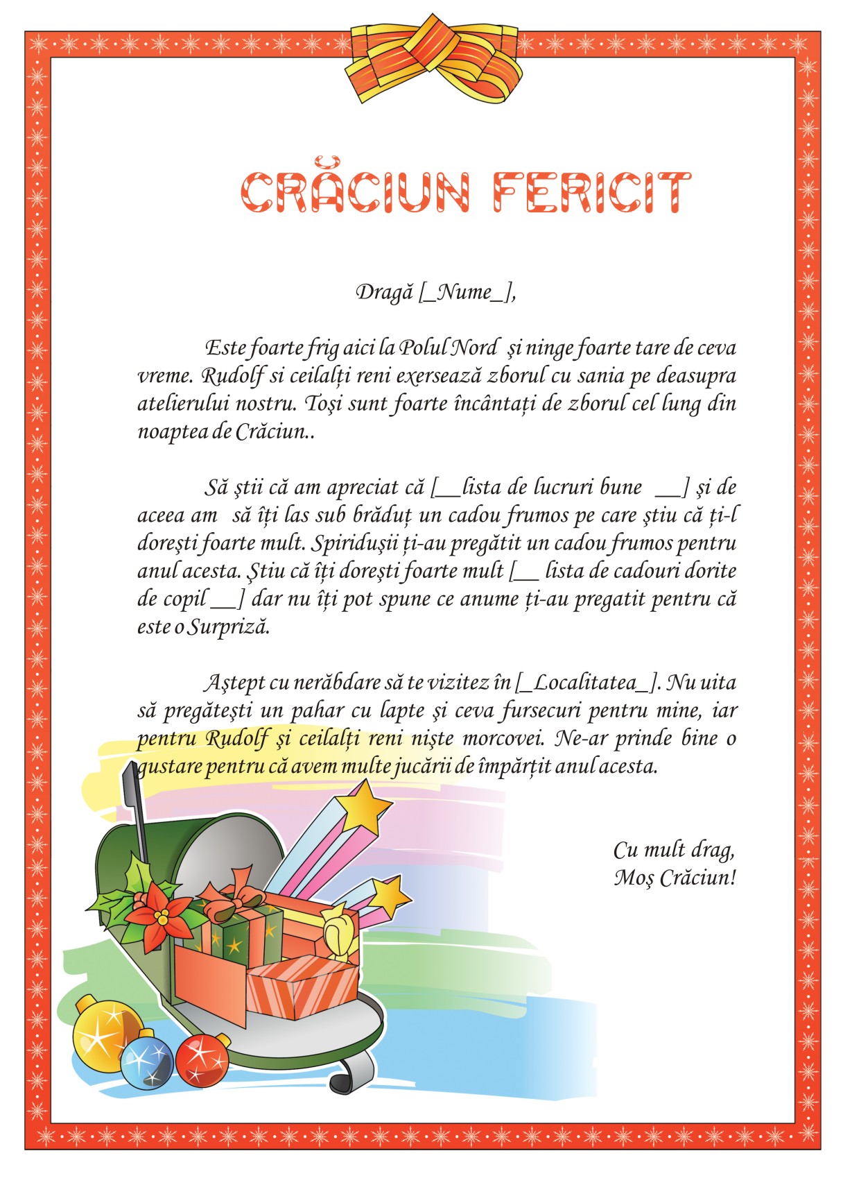 Astept cu nerabdare sa te vizitez in [__Localitate__]. Nu uita sa pregatesti un pahar cu lapte si ceva fursecuri pentru mine, iar pentru Rudolf si ceilalti reni niste morcovei. Ne-ar prinde bine o gustare pentru ca avem multe jucarii de impartit anul acesta.