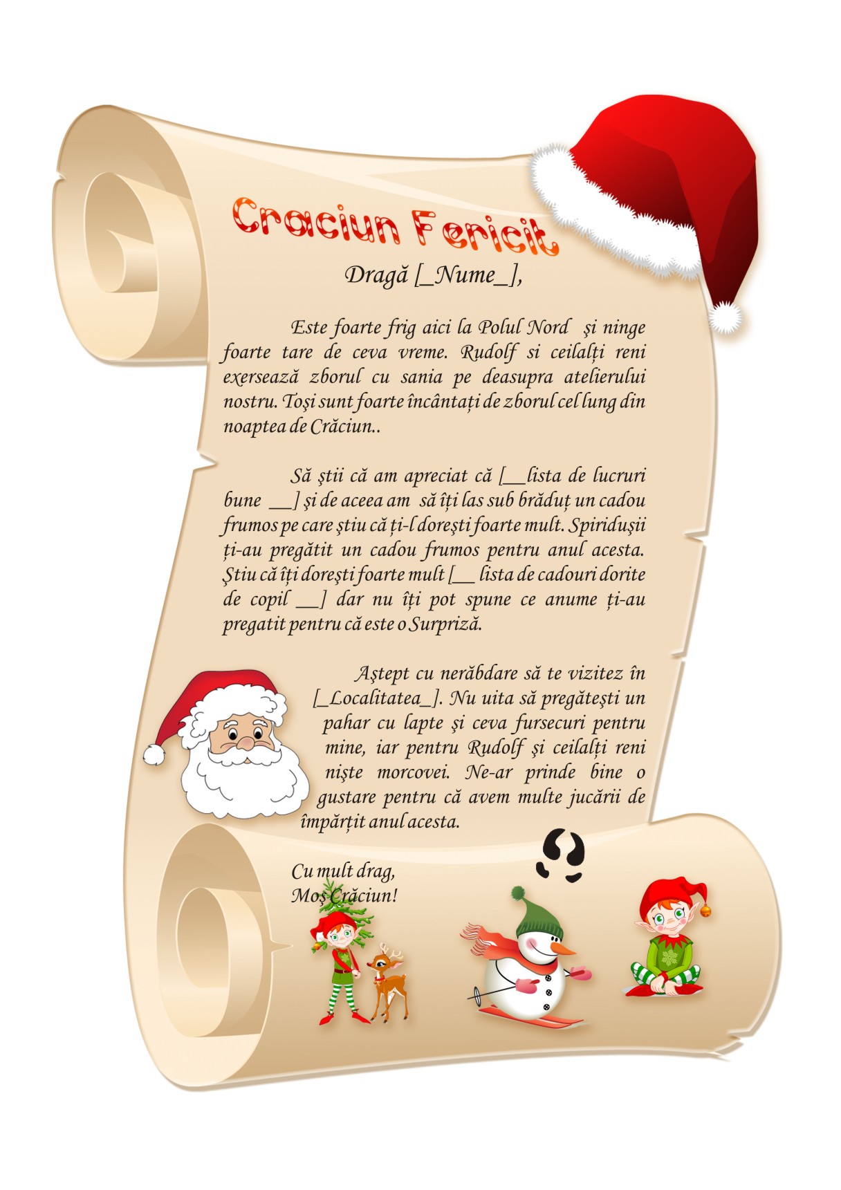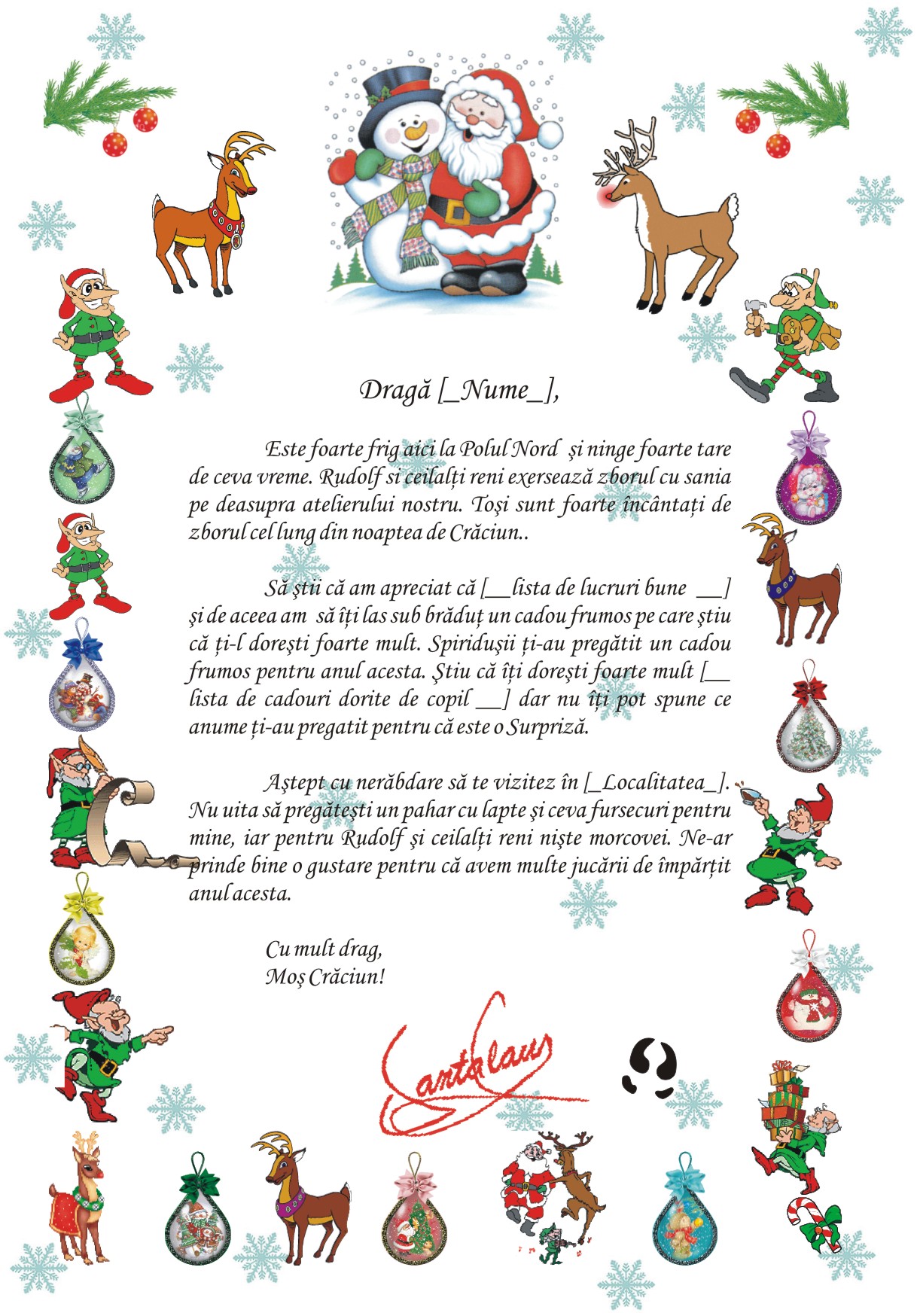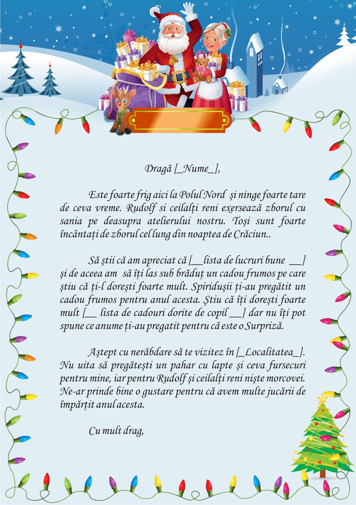 Astept cu nerabdare sa te vizitez in [__Localitate__]. Nu uita sa pregatesti un pahar cu lapte si ceva fursecuri pentru mine, iar pentru Rudolf si ceilalti reni niste morcovei. Ne-ar prinde bine o gustare pentru ca avem multe jucarii de impartit anul acesta.