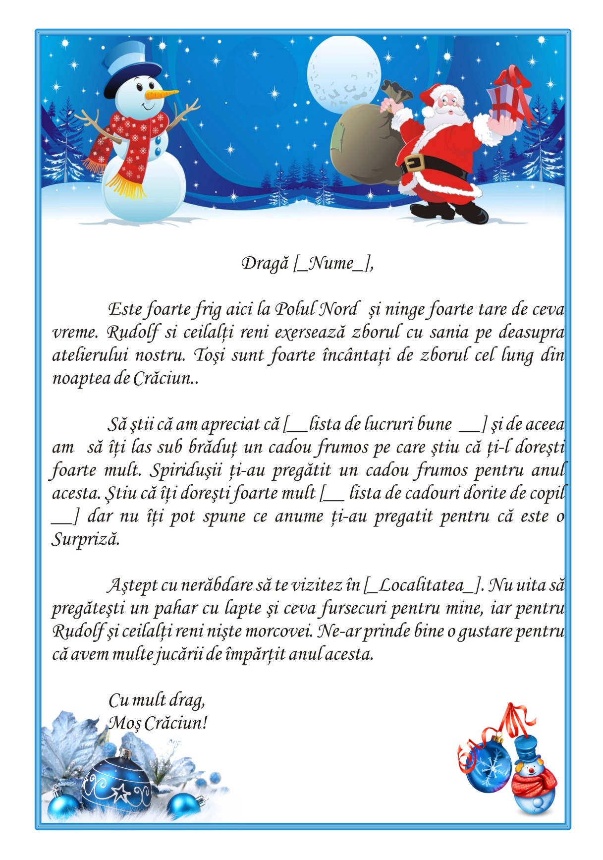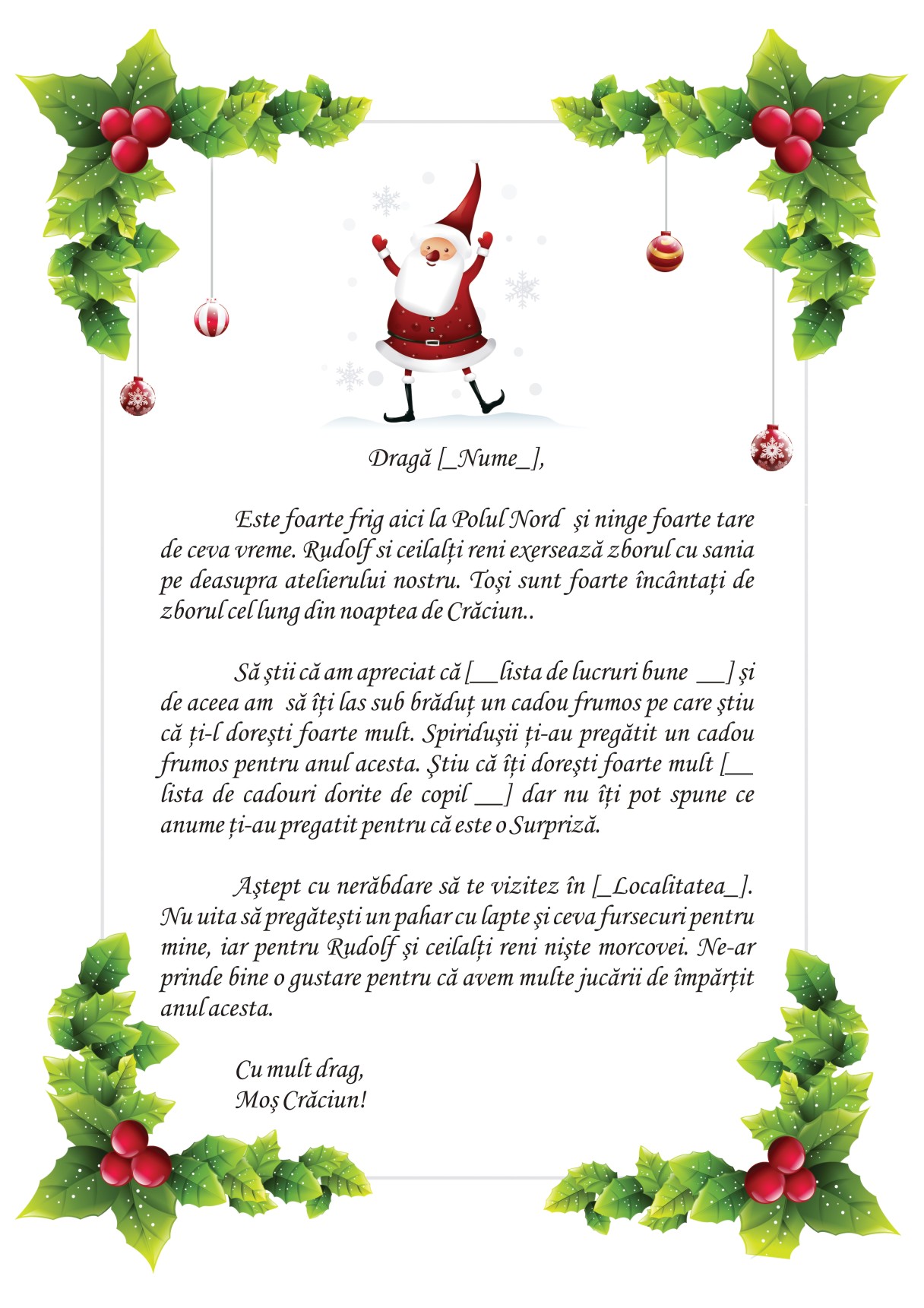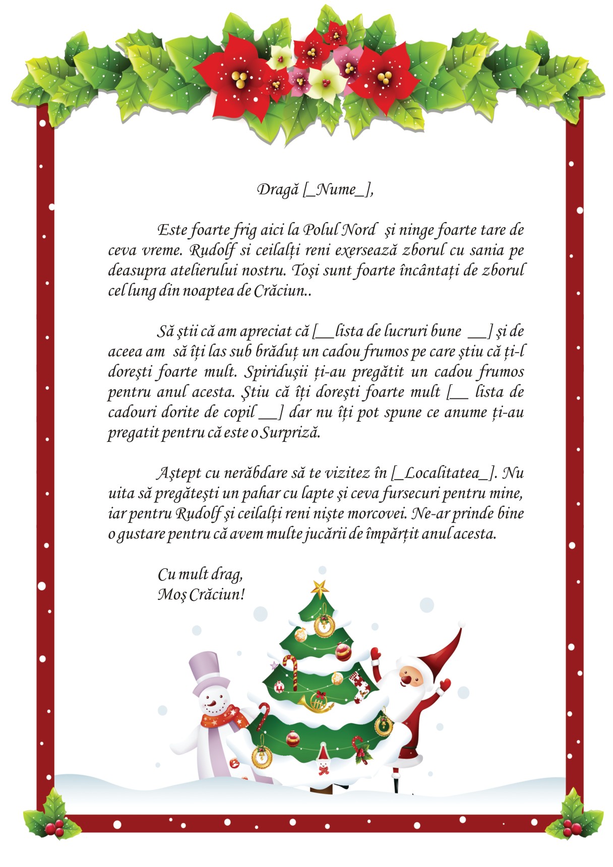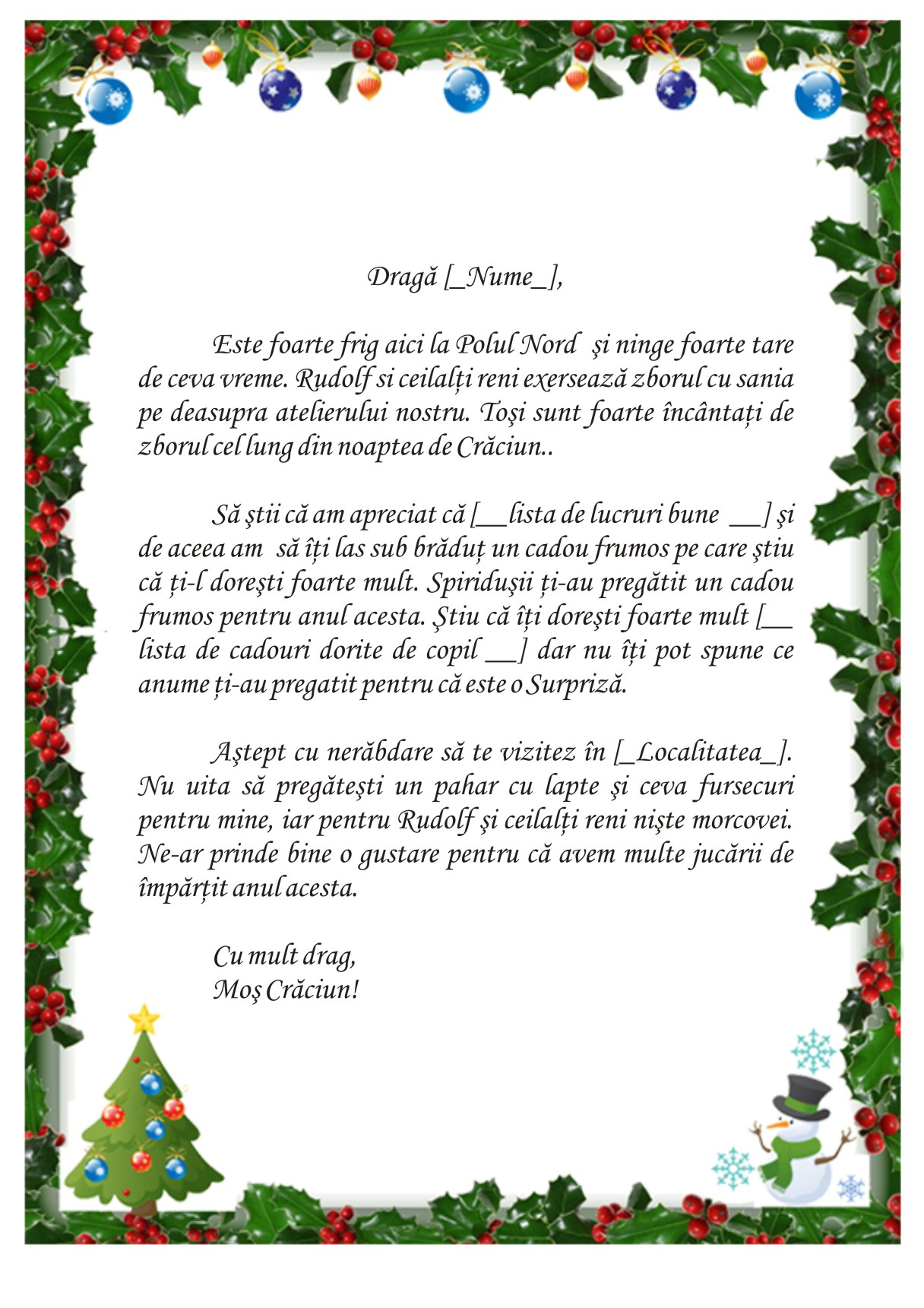 Astept cu nerabdare sa te vizitez in [__Localitate__]. Nu uita sa pregatesti un pahar cu lapte si ceva fursecuri pentru mine, iar pentru Rudolf si ceilalti reni niste morcovei. Ne-ar prinde bine o gustare pentru ca avem multe jucarii de impartit anul acesta.